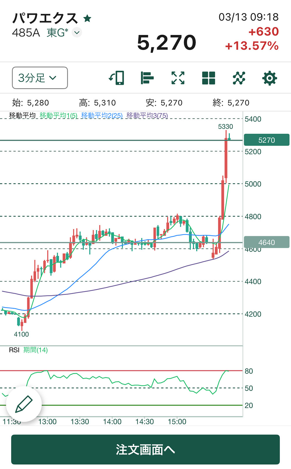 全体的に下げ目線の中、勢いよく上がるパワエクス。直近IPO銘柄の中でも一際異彩を放つこの銘柄。多くの銘柄が下がる中、日足順調。「お祭り会場」はコチラ状態です。