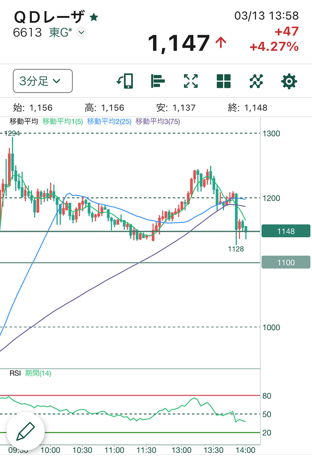 午前の勝利で得た余裕を軍資金に意気揚々とエントリーしたのがQDレーザ(6613)。これが全ての過ち。エントリーした直後の大陰線。