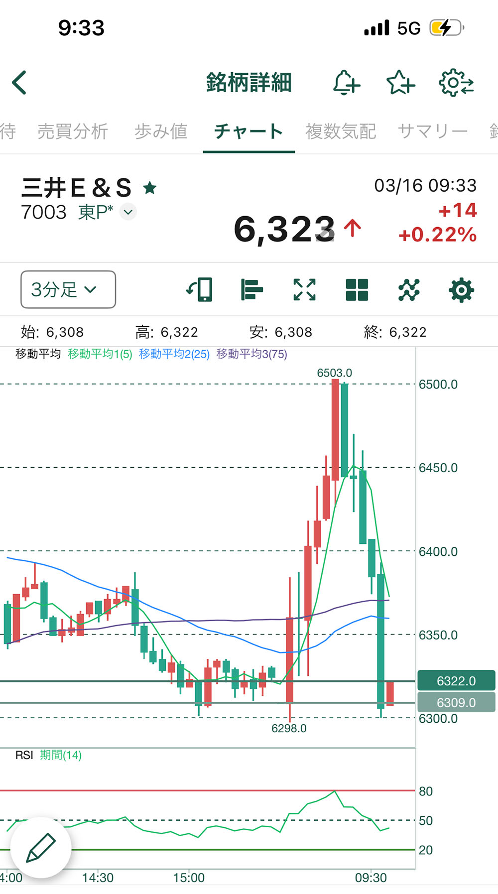 寄付陽線か。移動平均(25)を越えたしエントリーしても良…下髭ドーン→危ない!エントリーしなくて良かった→って上がるんかーい!(さっきの下髭で入れば良かった)→キリ番¥6,400に押し戻されるだろうから入りづらい→¥6,400越えた!エントリーしようかな…一瞬の上髭!ここが天井かも!?高値掴み怖い(様子見)→まだ上がるんか〜い→さすがに上がりすぎてもう怖いから止めとこ→入れず。