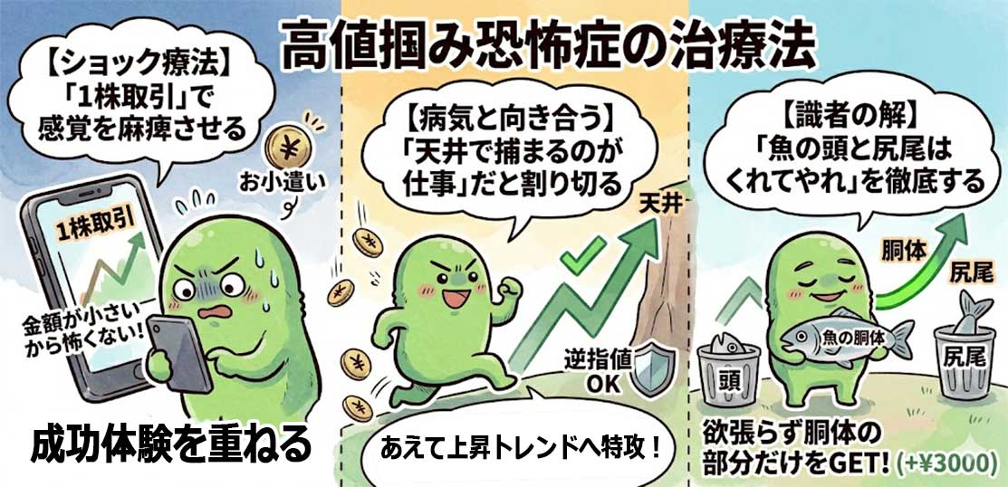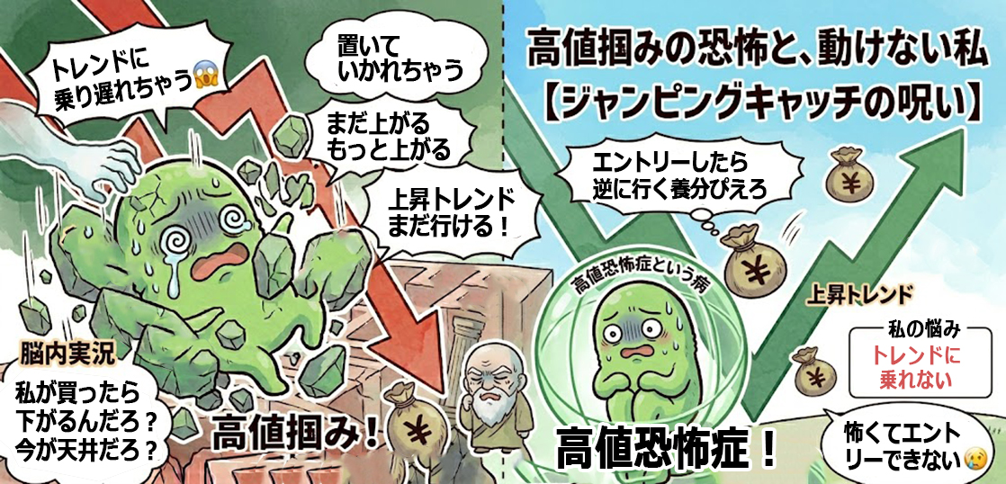 勢いよく上がっている時ほど「まだ行く」「もっと行く」「置いていかれるな」とエントリーした直後に急降下。それが、高値掴み。そこを経験した先に待っているのが高値恐怖症という病(←今ココ)。