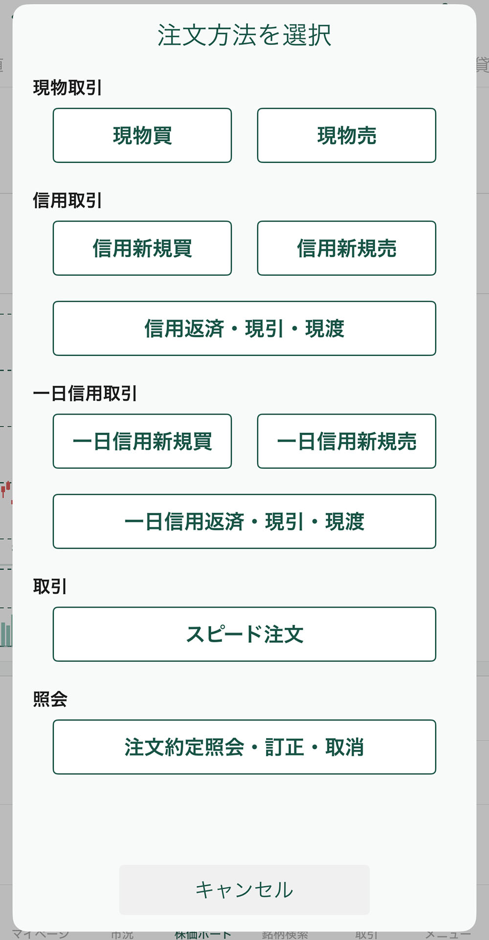 証券会社によって多少デザインは異なりますが、注文画面は大体こんな感じ(松井証券のスマホからの注文画面)。