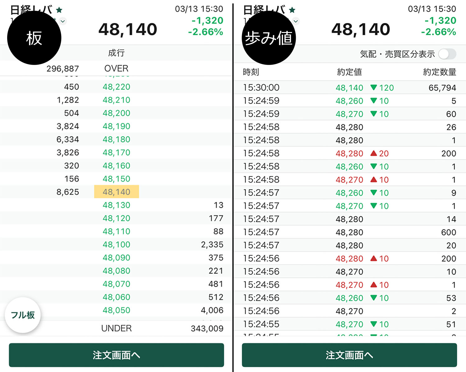 板(今の株価と売りたい/買いたい人の数)を見てこの先の値動きを予想し、歩み値(成立した売買履歴)を見て、買いの勢いが強いのか?売りの勢いが強いのか?を判断します。