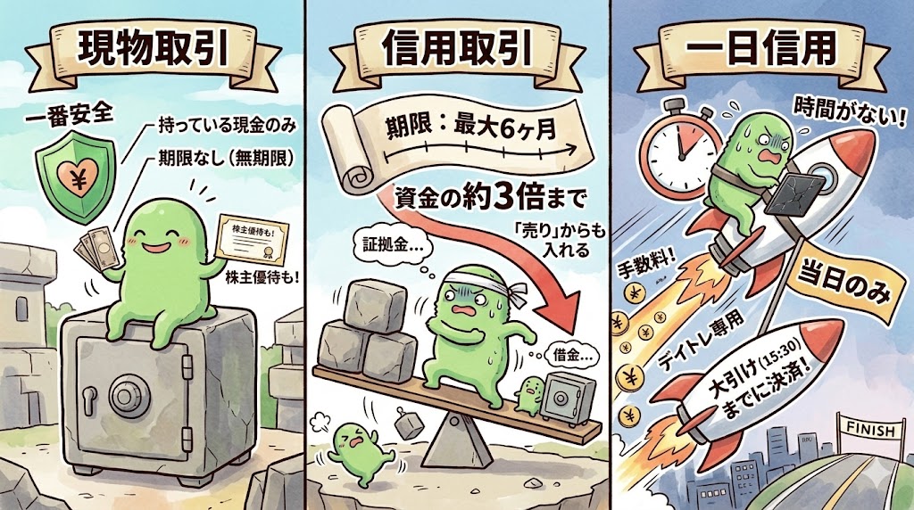 「現物(げんぶつ)」と「信用(しんよう)」と「一日信用(いちにちしんよう)」
