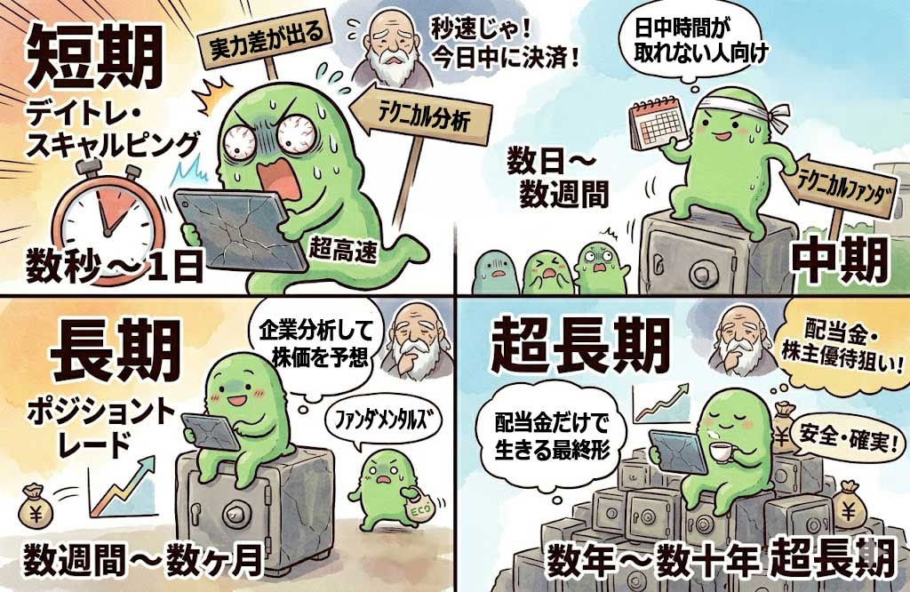 多くの人が想像している株式投資は長期・超長期です。同じ株の売買ながら保有する時間軸によってまったく戦略が異なるのも株の面白さ。