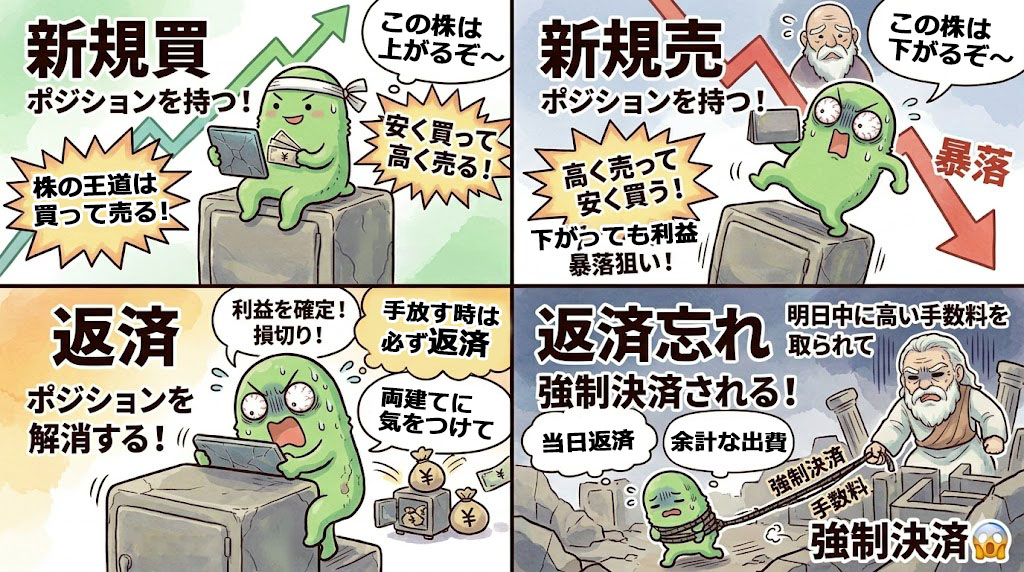 私がデイトレ初日にやってしまった大失敗。株は新しく買う時は新規買い→返済で売ります。返済までがワンセット。