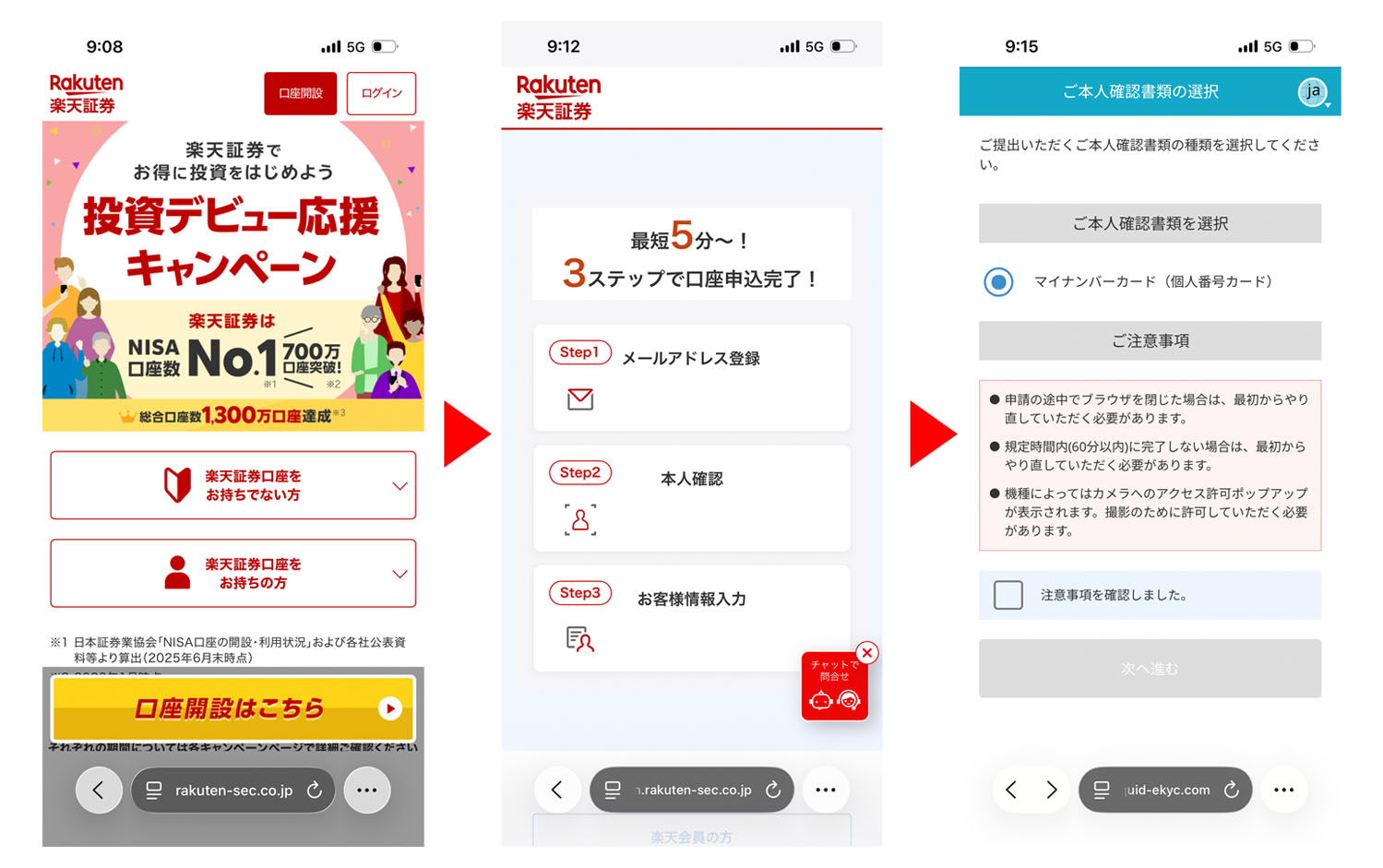 楽天証券口座開設ページより、メールアドレス登録→マイナンバーカードで身分証明→その後は表示通りに進む。