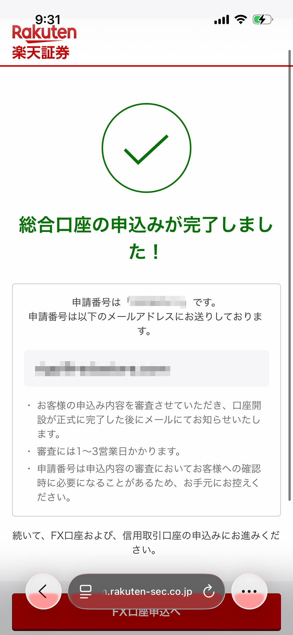 電車に乗りながら口座開設しようと9:08に口座開設を始め、スクショしたり、電車の乗り換えしたり、マイナンバーカードを探したり、オフィスまで歩いたりしながら間空いてしまったものの、9:31に楽天証券口座開設終了!