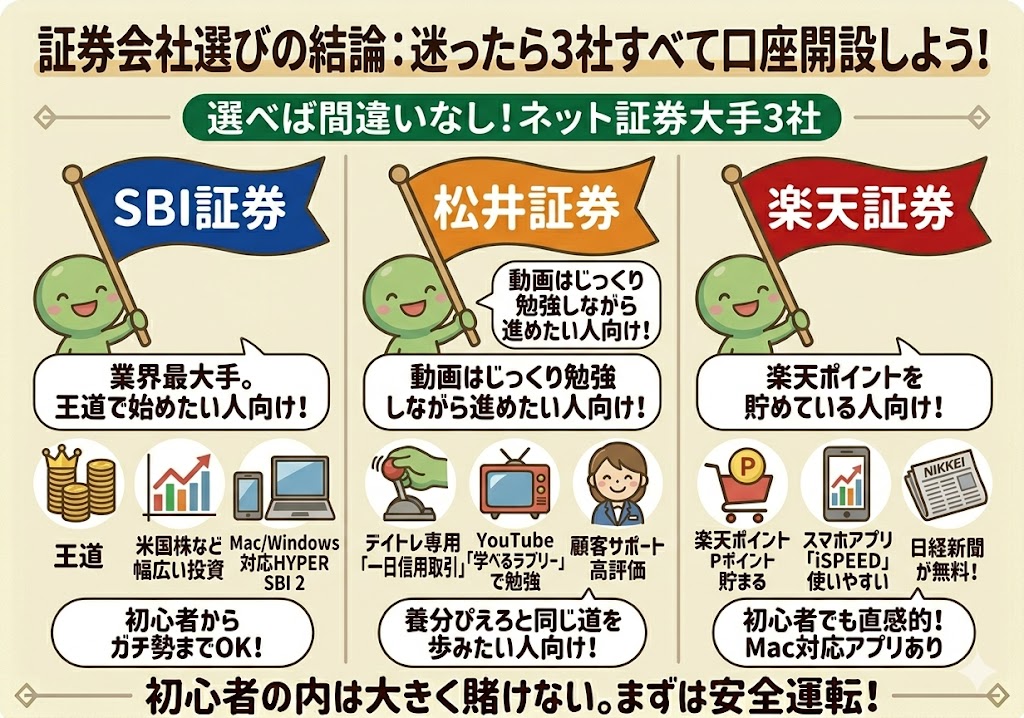 SBI証券、楽天証券、松井証券 から選べば間違いなし。