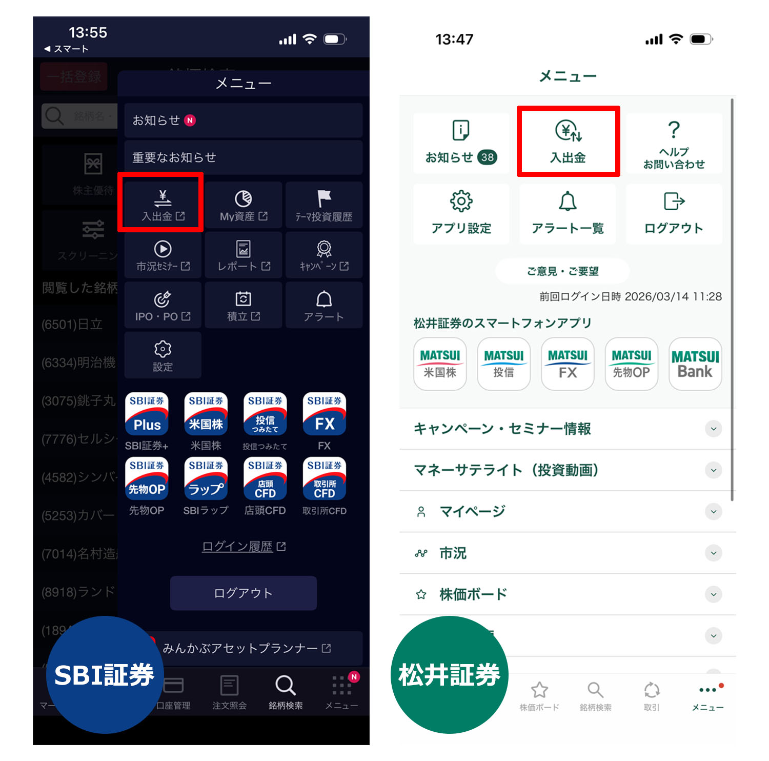 ↑SBI証券と松井証券の入金方法です。